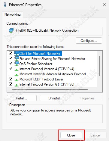 Ethernet0 Properties ekranında Close diyerek yapılandırmayı tamamlıyoruz.