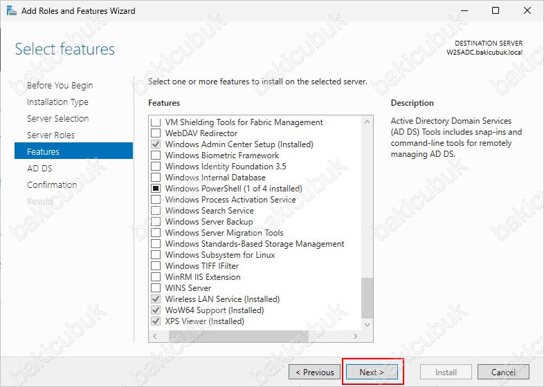Select features ekranında sunucumuz üzerine kurabileceğimiz Features ( Özellikler ) görüyoruz.