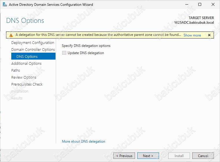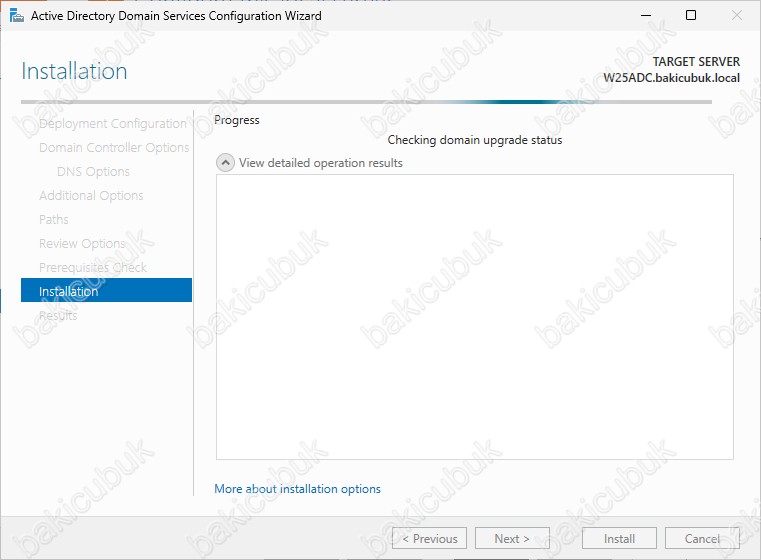 Biz mevcut ortamımız da bakicubuk.local isimli Active Directory Domain yapısı içerisinde Additional Domain Controller yapılandıracağımız için ve sunucumuzu Active Directory Domain yapısına dahil ettiğimiz için Specify the domain information for this operation bölümü altında bulunan Domain bölümüne bakicubuk.local isimli Active Directory Domain yapısın geldiğini görüyoruz. Eğer sunumuzu Active Directory Domain yapısına dahil etmemiş olsaydık Specify the domain information for this operation bölümü altında bulunan Domain bölümü boş olarak görecektik.