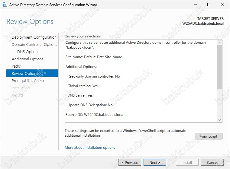 Review Options ekranında View Script seçeneğine tıklayarak Active Directory Domain Services rolü ve Additional Domain Controller yapılandırması için yapmış olduğumuz yapılandırmayı PowerShell komutu olarak dışarıya alarak kurulum yapabilirsiniz.