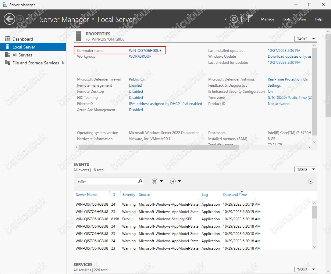 Sunucumuz yeniden başladıktan sonra Server Manager konsolu üzerinde Computer name bölümünde sunucumuzun isminin yapılandırdığımız şekilde geldiğini görüyoruz.