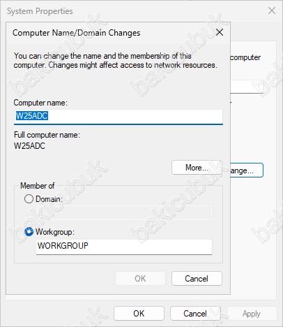 Computer Name/Domain Changes ekranın da Member of bölümü altında bulunan Domain bölümüne Active Directory Domain yapısını bakicubuk.local olarak yazıyoruz ve OK diyerek yapılandırmayı tamamlıyoruz.