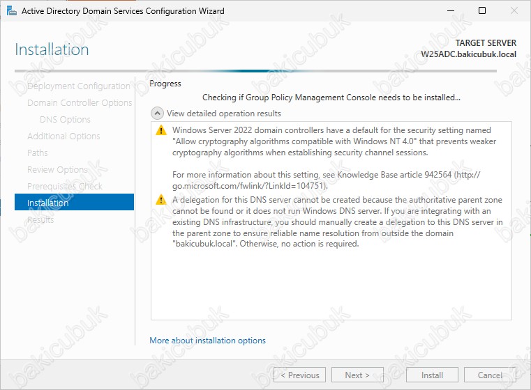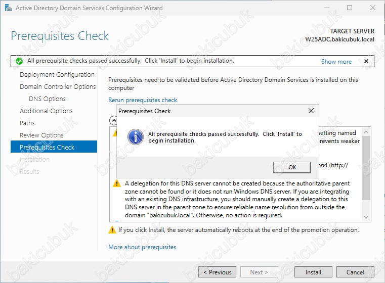 Prerequisities Check ekranın da Windows Server 2025 sunucumuz üzerinde Active Directory Domain Services rolü ve Additional Domain Controller yapılandırması için gerekli kontrolleri yaparak herhangi bir problem ya da eksiklik olup olmadığı kontrolünü yapıldı.